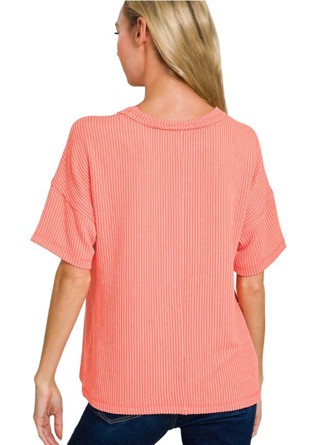 Coral Ribbed Short Sleeve Top