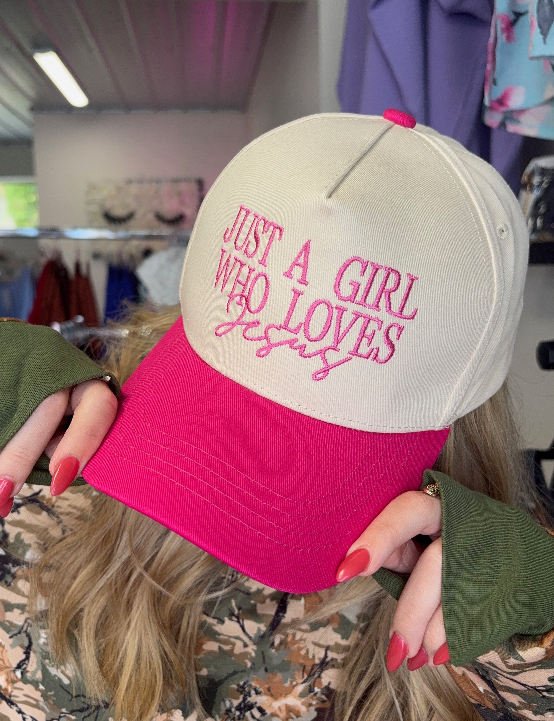 This playful white hat features a bright pink bill and the sweet phrase "just a girl who loves Jesus" embroidered in pink. With its adjustable strap, it offers a comfortable fit for everyday wear, letting you share your faith with a fun and stylish touch.