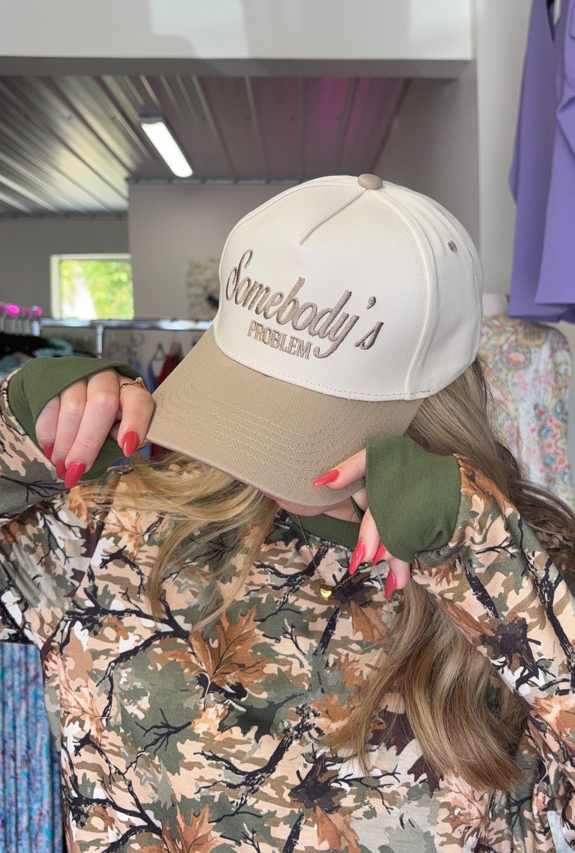 This playful white hat features a tan bill and bold golden "Somebody's Problem" lettering, making a cheeky statement wherever you go. The adjustable back ensures a perfect fit for all-day comfort and effortless style. Add a dash of attitude to your outfit with this fun and versatile accessory.