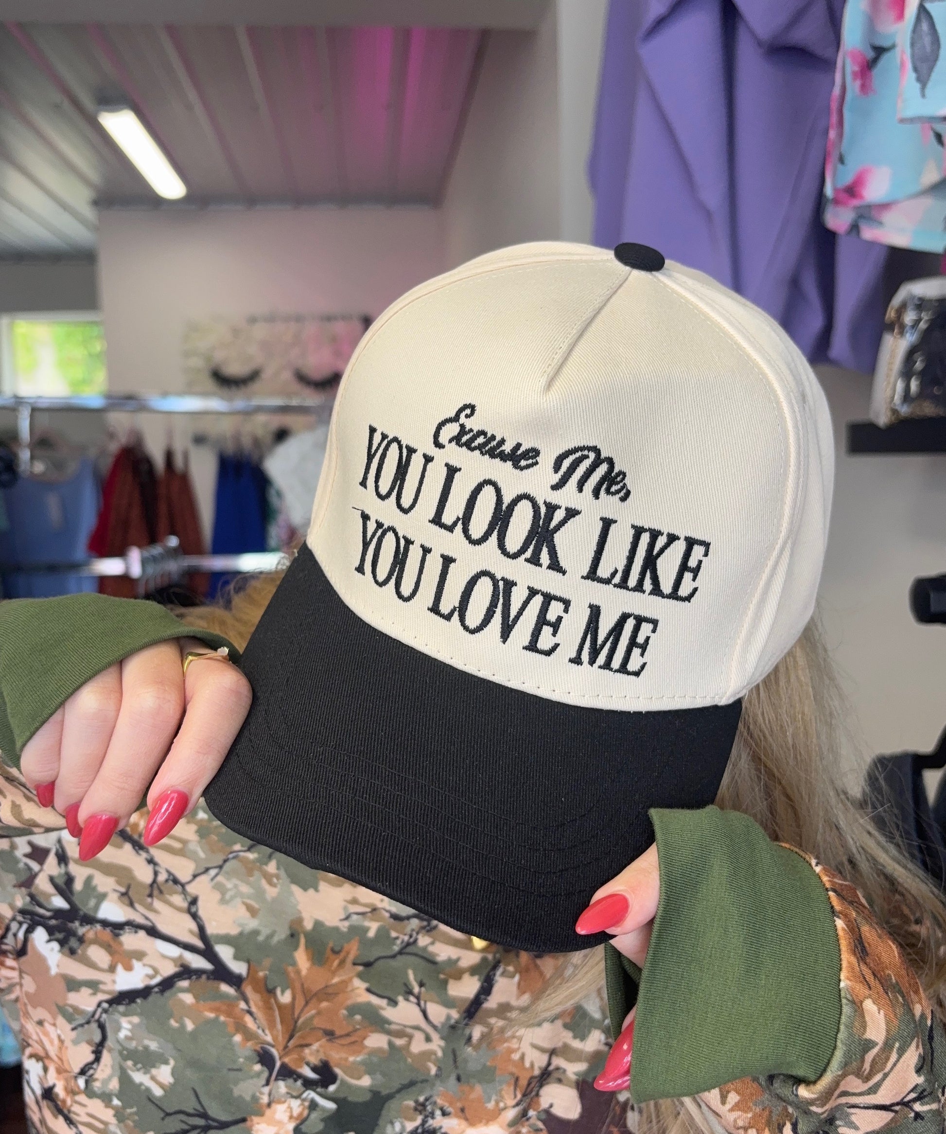 This playful white hat features a black bill and an adjustable strap for a perfect fit. The front displays bold black text saying "excuse me, you look like you love me," adding a cheeky touch to your casual style. Perfect for those who love to spark smiles wherever they go.