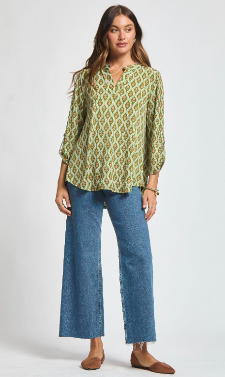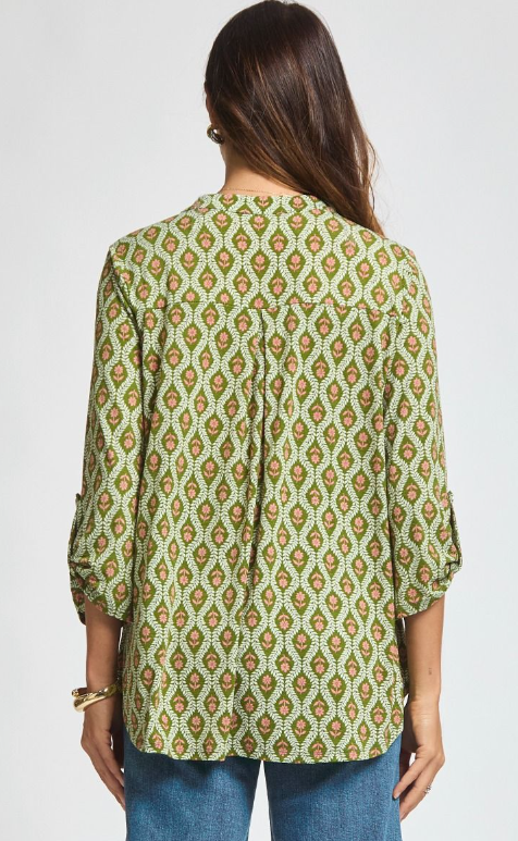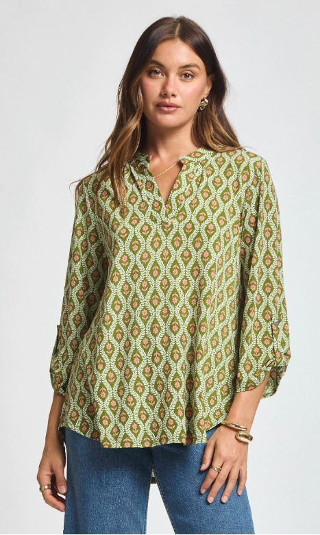 Our best-selling Lizzy Top just got a fresh floral twist! 🌿🌸 Featuring an olive base with leafy details and pops of pink daisy flowers, this top brings a soft, feminine vibe to your wardrobe. The wrinkle-free, lightweight poly blend is cooler than linen and totally travel-friendly. With a flattering flowy fit, mandarin collar, and 3/4 sleeves with tab details, it’s the perfect go-to for busy days or weekend getaways. Style it up or down—this one does it all!